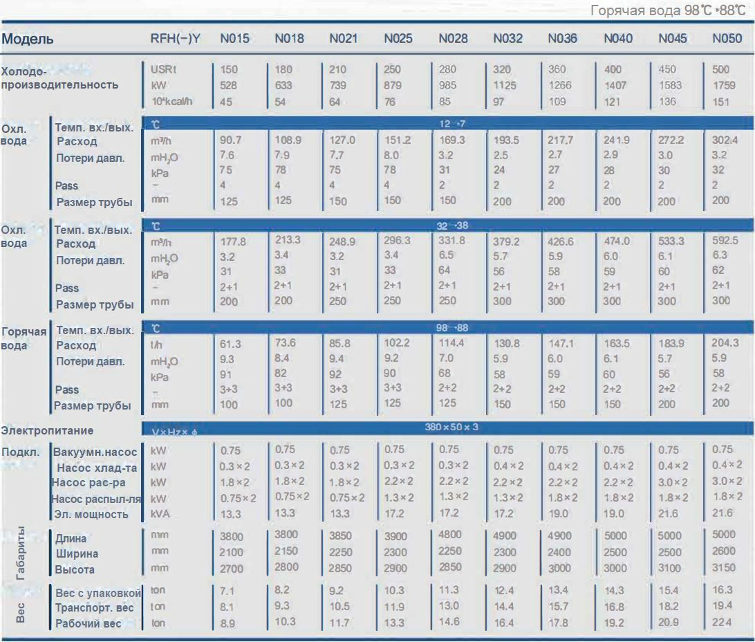 1. Максимальное рабочее давление для охлажденной воды, горячей воды, охлаждающей воды со стороны источника воды составляет 0,8МПа. Более высокое рабочее давление является необязательным. 2. Минимальная температура охлажденной воды на выходе составляет 5℃, минимальная температура охлаждающей воды на входе - 15℃. 3. Мощность холодопроизводительности: 20% ~ 100%, расход объема охлаждающей воды : 60% ~ 100%; 4. Раствор LiBr отгружается отдельно, и вес включается в общий вес.