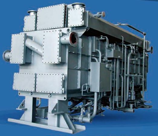 Конденсатор: охлаждающая вода поступает в теплообменные трубы конденсатора и конденсирует пар с внешней стороны трубок в воду, передавая тепло в градирню. Водный конденсат поступает в испаритель, хладагента. НТГ и конденсатор расположены в одной зоне с внутренним давлением около 57 мм рт. ст. (0,0076 МПа).