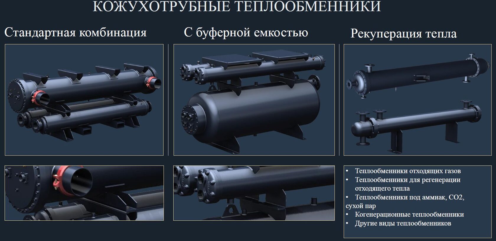Кожухотрубный теплообменник: Относится к теплообменникам, в котором поверхность теплообмена между двумя средами сформирована из труб, заключённых в кожух, а теплообмен осуществляется через поверхность этих труб. В кожухотрубном теплообменнике один из теплоносителей движется по трубкам (трубное пространство), другой — в межтрубном пространстве. При этом теплота от более нагретого теплоносителя через поверхность стенок труб передаётся менее нагретому теплоносителю. Кожухотрубный испаритель: Служит для охлаждения рабочей среды. В качестве рабочей среды может использоватьмя вода, пар, жидкости, содержащие антифриз. В кожухе – жидкость, в трубках хладагент. Кожухотрубный конденсатор: Служит для переноса тепловой энергии от хладагента в окружающую среду. Чаще всего тепло передается воде или воздуху. Охлаждающая вода циркулирует по трубкам, тогда как конденсация хладагента происходит в кожухе.