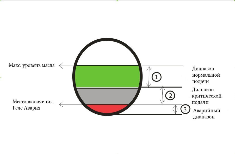 Режимы работы Смотровое стекло уровня масла поделено на диапазоны: Нормальный уровень масла 40-60% высоты смотрового стекла Критический уровень масла 25-40% высоты смотрового стекла Аварийный уровень масла <25% высоты смотрового стекла