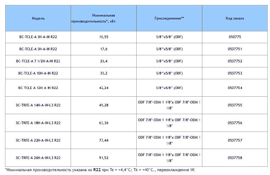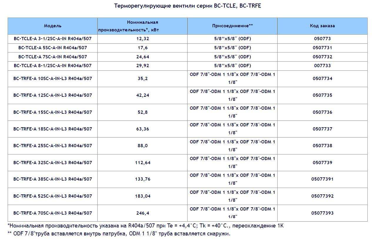 Характеристики: Разборная конструкция со сменными силовыми элементами и вставками. Диафрагма большого диаметра обеспечивает стабильную работу ТРВ. Доступна функция MOP (Максимальное рабочее давление). Доступны корпуса прямоточного и углового исполнения. Доступны модели для R22, R134a, R407C, R404A/R507. Двунаправленная конструкция пригодна для работы в тепловых насосах. Диапазон температур кипения - 45…+10°C Комплект поставки: силовой элемент, расширительная вставка, корпус ТРВ (TCLE с медными патрубками под пайку, TRFE – латунный корпус) Холодопроизводительность от 12.32 кВт до 246 кВт на R404/507 При температуре кипения To = +4,4C; Температура конденсации Tk = +38C Переохлаждение 1K. Поставляются в сборе с клапанной вставкой.